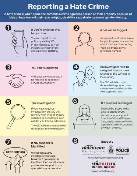 2.2 If you experience or witness a hate crime – where someone commits a crime against you or your property because of bias or hate toward your race, religion, disability, sexual orientation or gender identity – you should report it to the police.